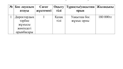 Жаңалықтар Ноя 5, 2025 Бос педагог лауазымына конкурсы туралы хабарландыру! ХАБАРЛАНДЫРУ. Педагогтің бос және (немесе) уақытша бос лауазымына қабылдау туралы «Ақтөбе облысының білім басқармасы Хромтау ауданының білім бөлімі» ММ «Бөгетсай мектеп-гимназиясы» КММ-де дирек...