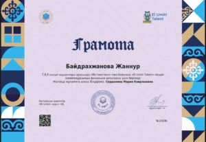 7, 8, 9 сынып оқушылары арасында «Математика» пәні бойынша «El Umiti Talent» пәндік олимпиадасының финалына қатысқаны үшін Байдрахманова Жаннұрға берілген алғыс хат. Жетекшісі Сердалина Мария Каирлыевна