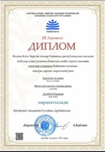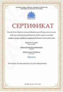 Жәнібекқызы Жұлдызай Сертификатқа ие. Жетекшісі: Уристемқызы Ж.