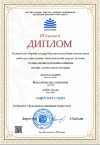 11 класс оқушысы Серікбаева Ақкүміс ІІІ орынға ие болды. Жетекшісі: Елемесова А.С