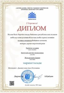 Облыстық жалпы білім беретін пәндер бойынша ғылыми жоба байқауына қатысушы 9-класс оқушысы Абуғали Абзал грамотамен марапатталды.