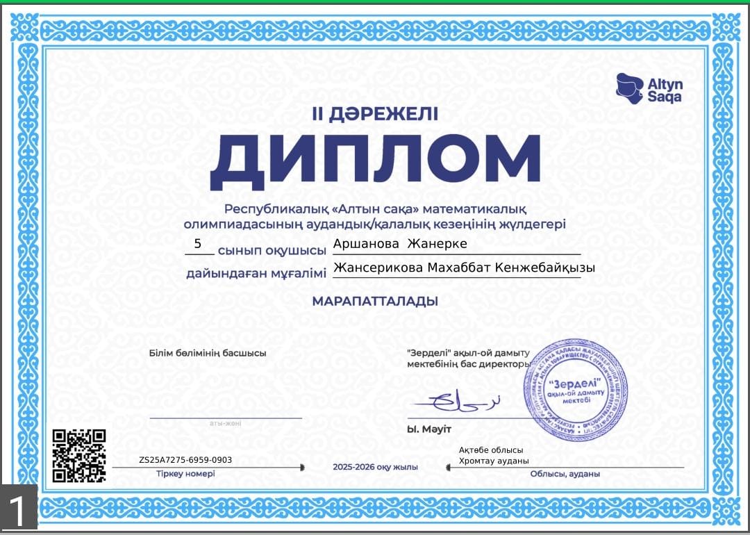 Республикалық «Altyn Saqa» математикалық олимпиадасының аудандық\қалалық кезеңінің ІІ дәрежелә диплом жүлдегері атанған 5 сынып оқушысы Аршанова Жанерке. Дайындаған жетекшісі Жансерикова Махаббат Кенжебайқызы.