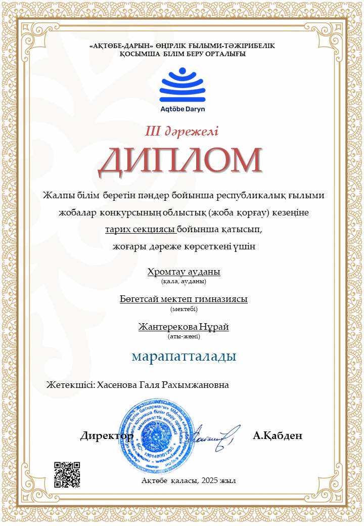 3. Этномәдениеттану бағыты бойынша 7 сынып оқушысы Жантерекова Нұрай Бас жүлде, жетекшісі Хасенова Галя Рахымжановна/ Республикалық кезеңге жолдама