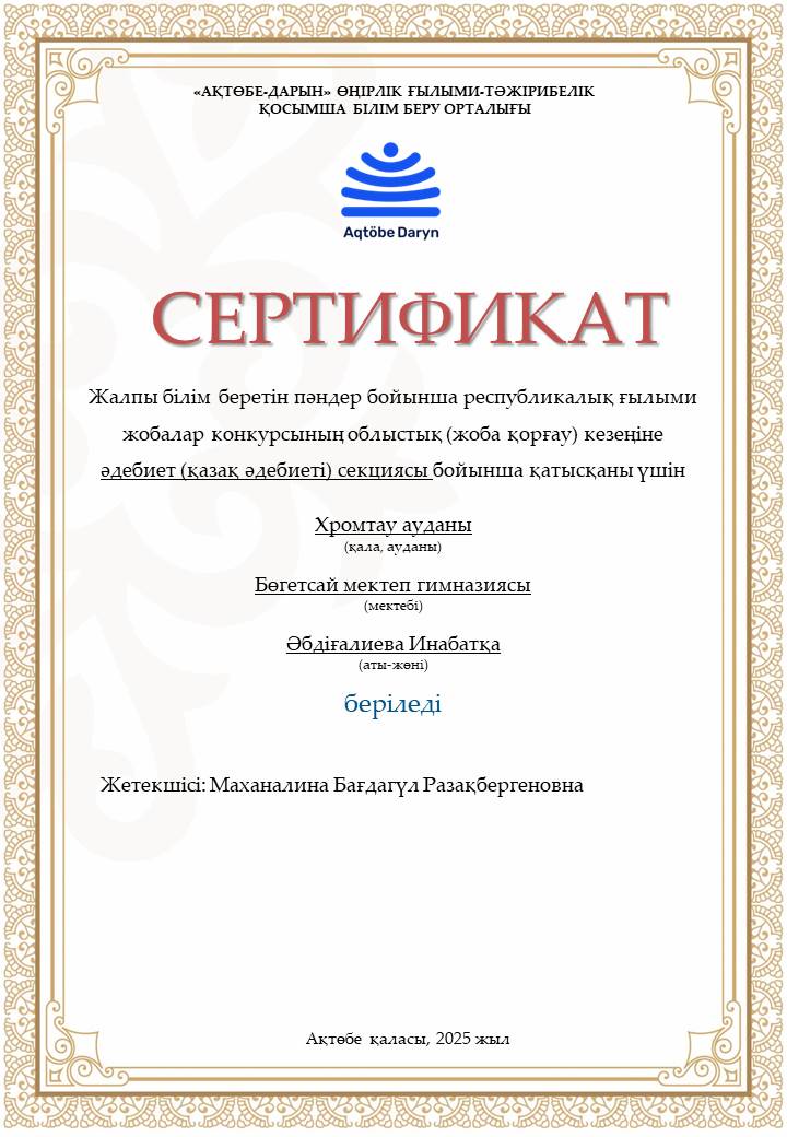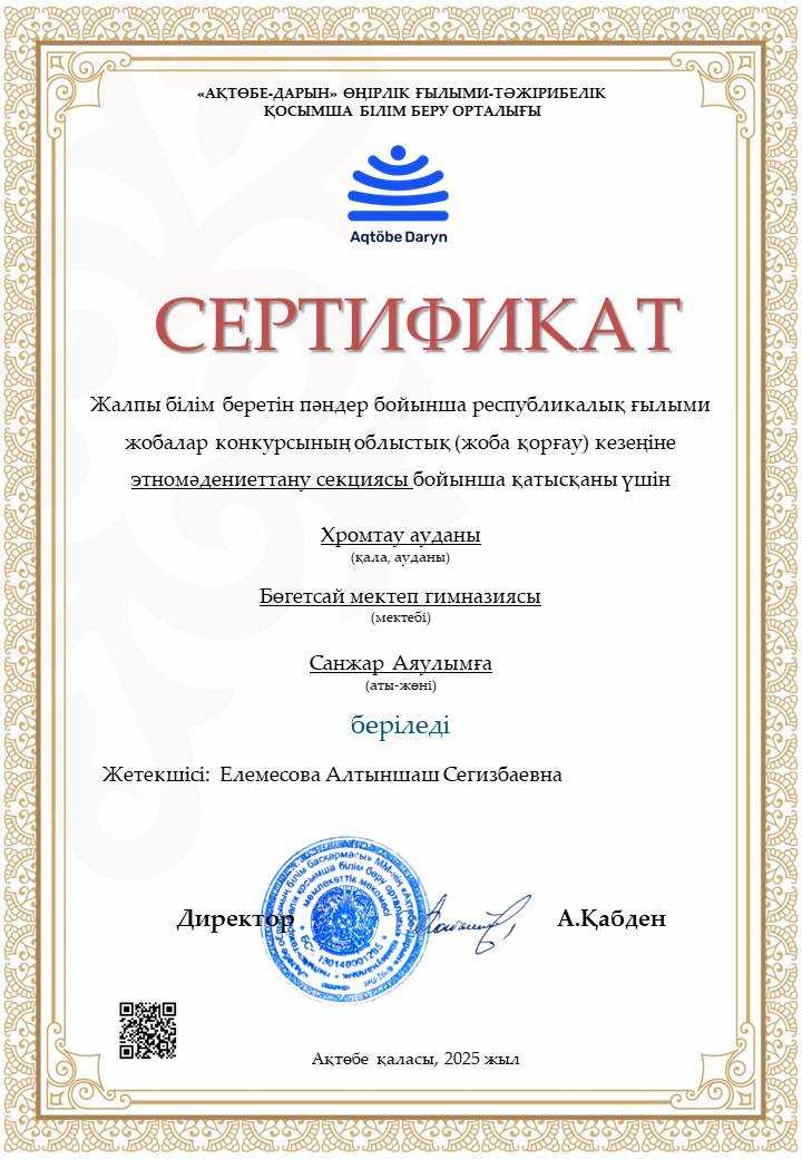 Жәнібекқызы Жұлдызай Сертификатқа ие. Жетекшісі: Уристемқызы Ж.