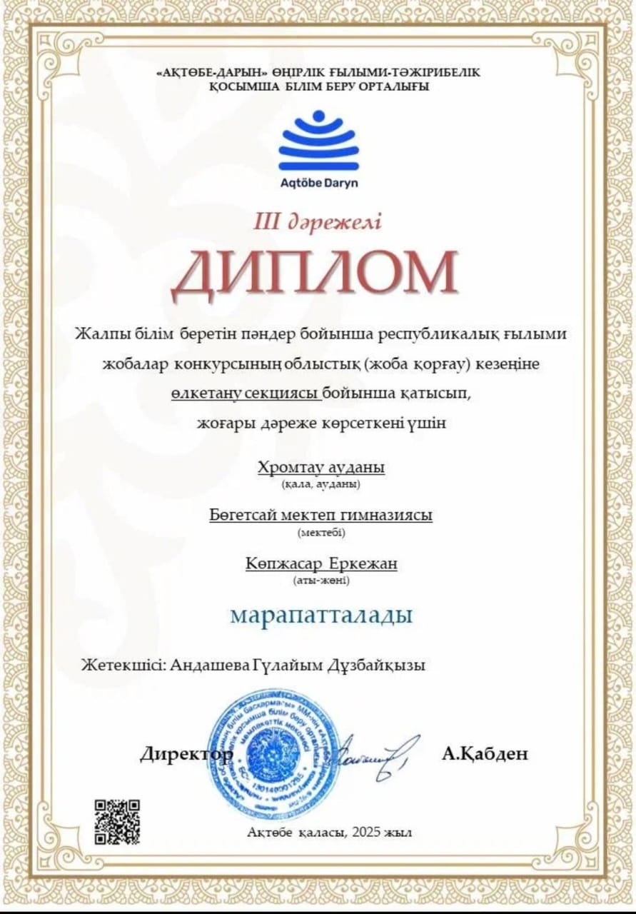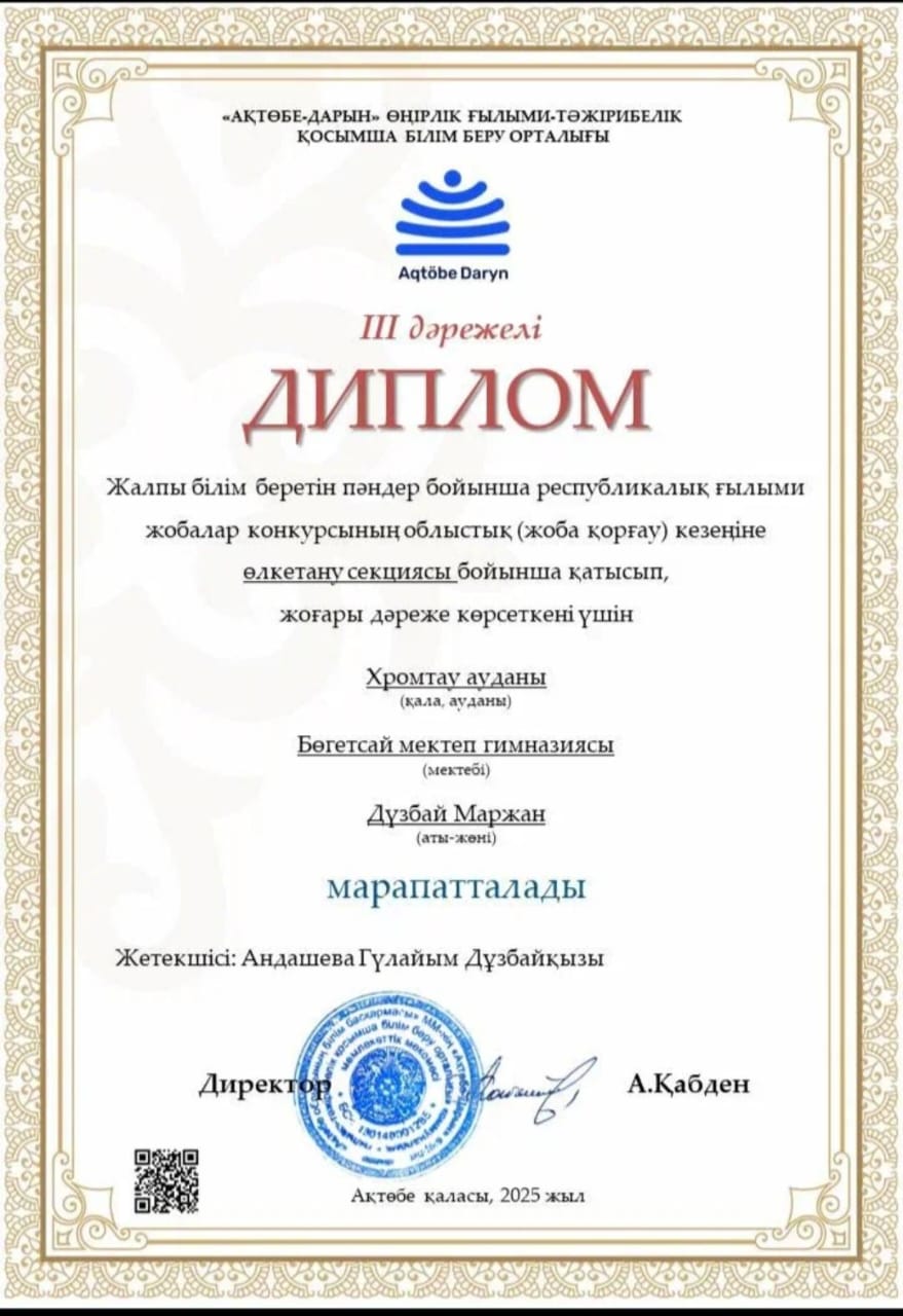 «Менің туған өлкем» география пәні бойынша байқаудан Дүзбай Маржан Сертификатқа ие болды. Жетекшісі: Андашева Г.Д