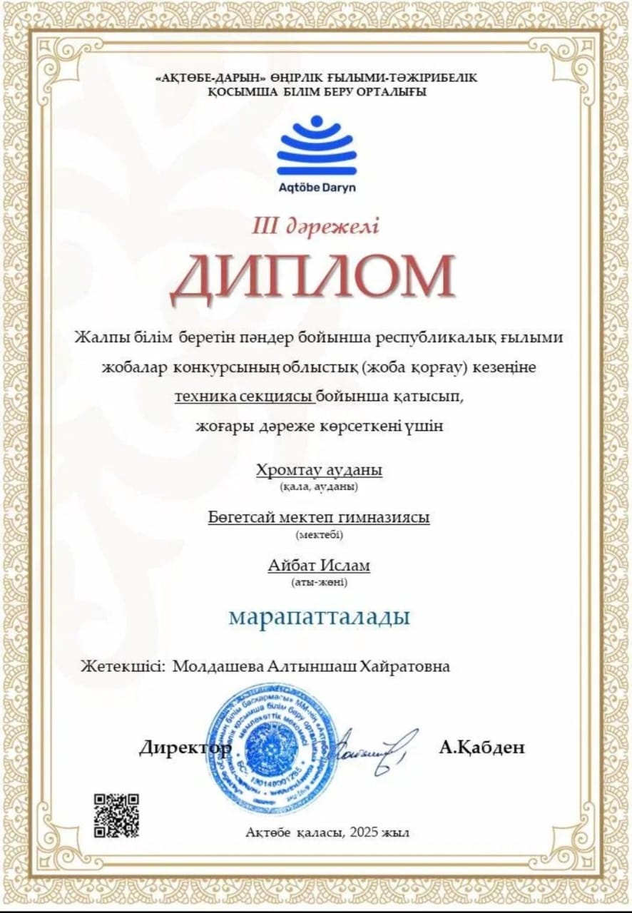 5. Физика,космос бағыты бойынша 7 сынып оқушысы Айбат Ислам І орын, жетекшісі Молдашева Алтыншаш Хайратовна